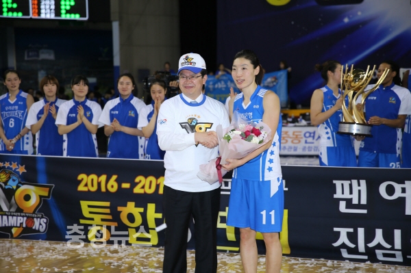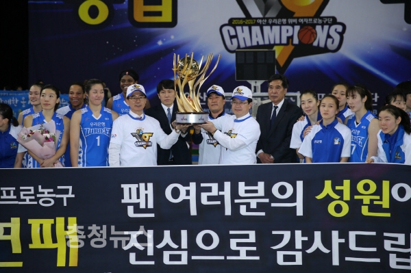 이로서 아산시로 둥지를 옮긴 농구단은 ‘5회 연속 통합우승’을 이뤄냈고, 이제는 아산시에 완전히 정착하고 있다는 평가를 받고 있다. 이광구 우리은행장과 함께 자리한 복기왕 아산시장은 “선수들이 마지막까지 최선을 다하는 경기를 통해 크게 감동받았고, 우리 아산시민에게도 승리의 기운이 전달되길 기대한다.”면서 기쁨을 전했다.