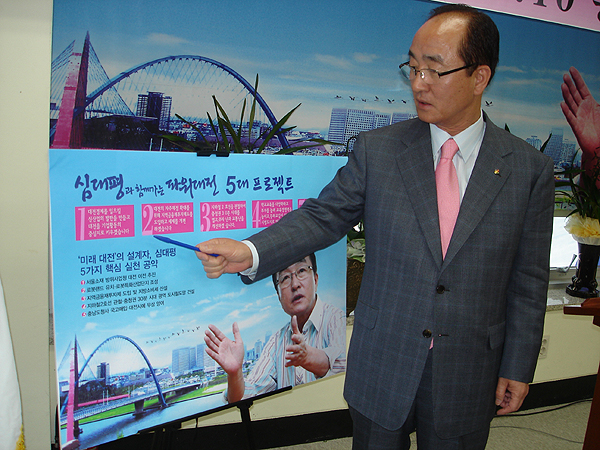 심대평 후보가 침체된 대전경제를 일으키는데 올인 하겠다 며 5대 비젼 20대 공약을 발표했다.