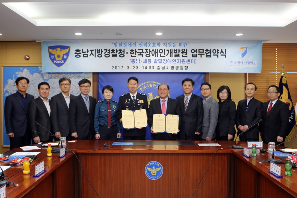 충남경찰청(청장 김재원)은 23일 충남경찰청 중회의실에서 한국장애인개발원(원장 황화성)-충청남도·세종특별자치시 발달장애인지원센터와 발달 장애인 권익 옹호와 지원을 위한 업무 협약을 체결했다고 밝혔다.