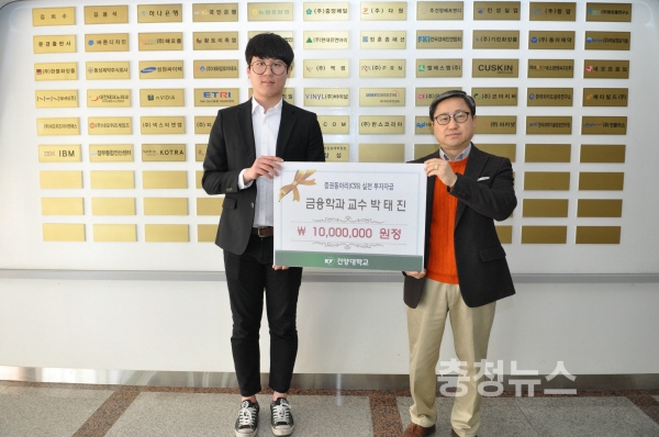 27일 오전 건양대 논산 창의융합캠퍼스에서 열린 기부식에서 박 교수는 교내 증권동아리 CSS의 회장을 맡고 있는 안봉찬(글로벌경영 4학년) 씨에게 직접 투자자금을 전달했다.