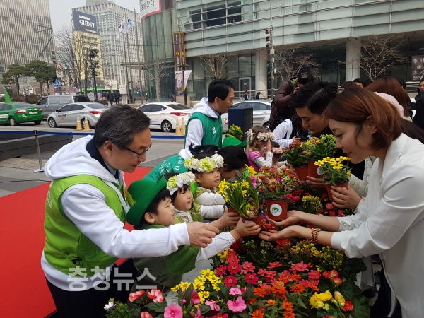 =윤영균 한국산림복지진흥원장이 28일 서울 청계광장에서 열린'2017 희망의 나무 나누기' 행사에서 시민들에게 꽃화분을 나눠주고 있다.