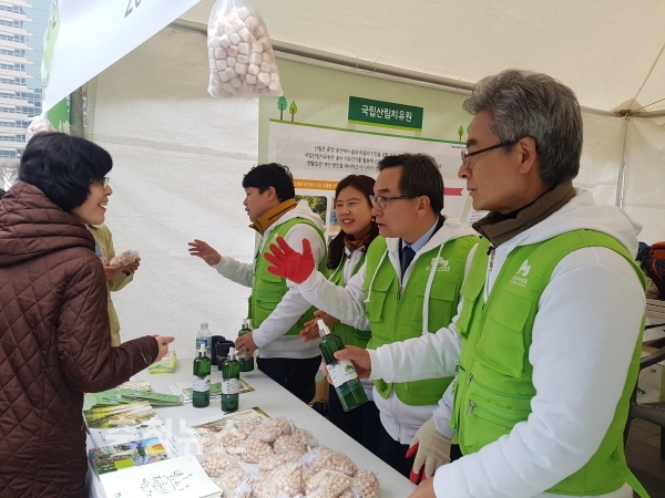 한국산림복지진흥원이 대상(주)과 28일 서울 청계광장에서 '2017 희망의 나무 나누기' 행사를 벌였다.