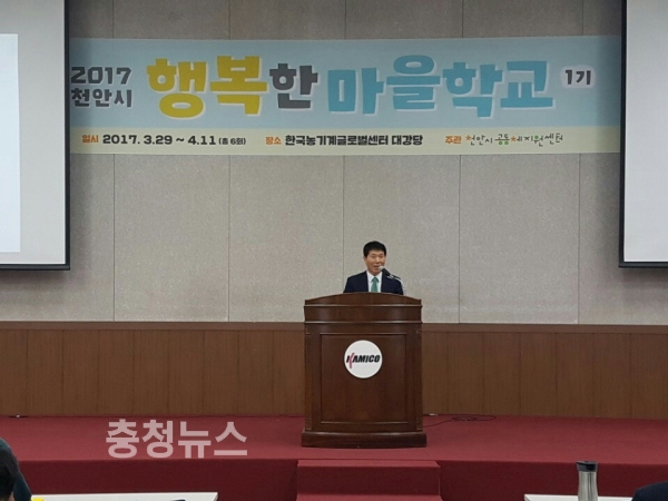 시는 29일 성거읍 삼곡리 한국농기계글로벌센터에서 각 읍·면 마을주민 100여명이 모인 가운데 ‘2017 제1기 행복한 마을학교’ 입교식을 열었다.