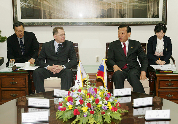 충청남도의회의장(김문규)은 23일 오전, 도의회 의장실에서 러시아 아무르주의회 대표단(의장 올레그 투르코프) 8명의 방문을 환영․접견하고, 도의회와 아무르주의회간 상호 교류협력 강화를 위해 의견을 교환했다.