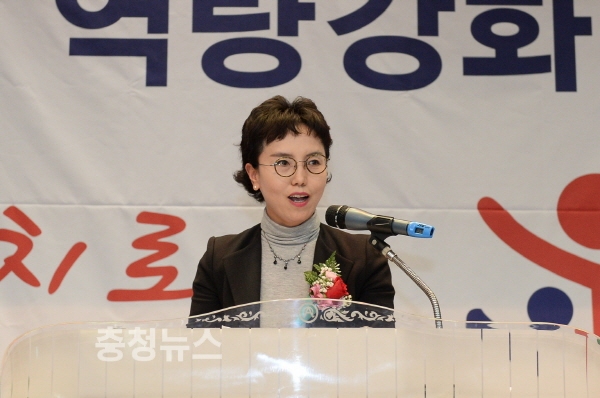 주민자치협의회 출범식 박미옥 초대회장 인사말 모습