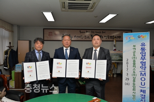 충남 부여군은 지난 29일 우수한 품질을 자랑하는 굿뜨래 농산물의 우선 공급과 유통 활성화를 위해 부여군과 ㈜홈플러스, ㈜삼흥농업회사법인 3자간 업무협약(MOU)을 맺었다.