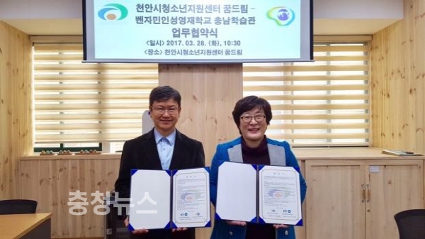 천안시청소년상담복지센터(지정운영 청소년지원센터 꿈드림, 센터장 최완열)와 벤자민인성영재학교(충남학습관장 이재숙)는 지난 28일 업무협약을 체결했다.