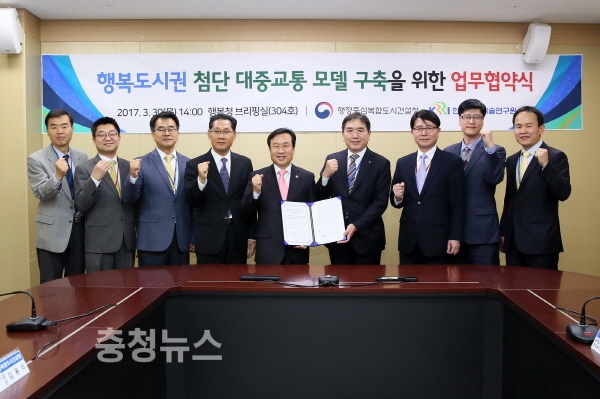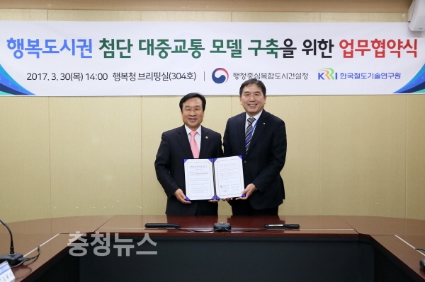 행정중심복합도시건설청(청장 이충재)은 행정중심복합도시를 첨단 대중교통중심도시 본보기(모델)로 조성하기 위해 한국철도기술연구원(원장 김기환)과 30일 업무협약(MOU)을 체결했다고 밝혔다.