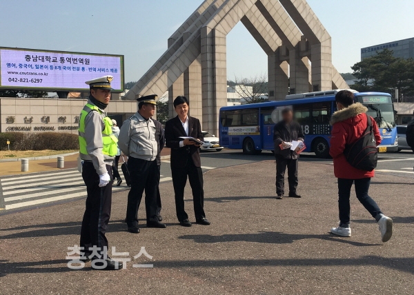 대전유성경찰서는 30일 유성구 충남대학교 오거리에서 ‘교통 사망사고 감소’를 위한 현장 점검을 실시했다.
