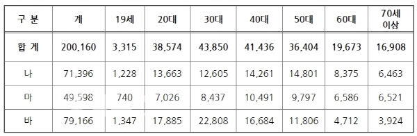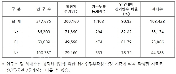 선거구별로 살펴보면(3월 31일 기준) △나선거구 7만1396명 △마선거구 4만9598명 △바선거구 7만9166명으로 나타났다.