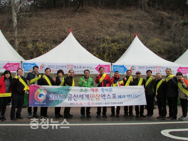 비가 오는 궂은 날씨에도 불구하고 2017금산세계인삼엑스포의 성공개최를 위해 민간지원의 자발적 조직인 ‘금산세계인삼엑스포 범군민지원협의회(회장 이철주)’를 비롯해 금산군 엑스포지원단이 홍보에 적극 동참했다.