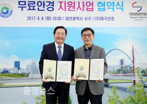 대전 서구(구청장 장종태)는 4일 구청 다목적실에서 ㈜태극안경(대표 류성형)과 ‘무료안경 지원사업’ 협약을 체결하고, 매년 저소득층 200명에게 무료로 안경을 지원하기로 했다고 밝혔다.
