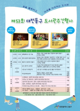 대전 동구(구청장 한현택)는 제53회 도서관주간을 맞아 이달 말까지 가오·용운·가양도서관을 비롯한 공공도서관 일원에서 풍성하고 다채로운 독서문화행사가 열린다고 6일 밝혔다.