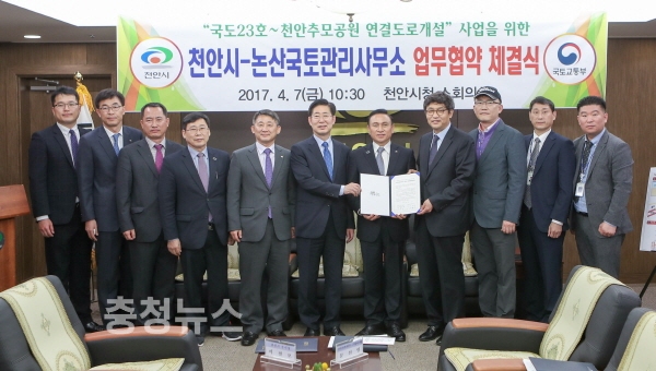 충남 천안시와 논산국토관리사무소(소장 김준범)는 7일 시청 소회의실에서 구본영 시장과 김준범 소장 등이 참석한 가운데 ‘국도23호~천안추모공원 연결도로개설사업’ 업무 협약을 체결했다.