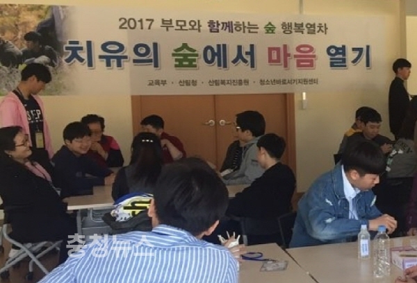 산림청이 교육부, 한국철도공사 등과 진행하는 '2017 숲으로 가는 행복열차' 사업이 지난 7~8일까지 경북 영주시 봉현면 국립산림치유원에서 학부모와 학생 등 60여 명이 참석한 가운데 다양한 프로그램으로 진행됐다.