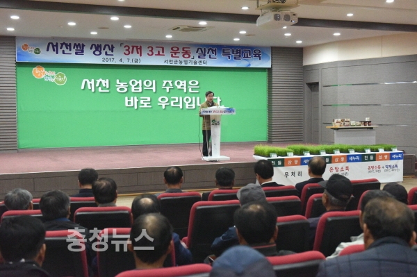 충남 서천군(군수 노박래)은 본격적인 못자리 설치를 앞두고 지난 7일 농업기술센터 교육관 및 벼 타작물 시험재배 포장 등에서『3저ㆍ3고 운동 실천 서천쌀 특별교육』을 실시했다.