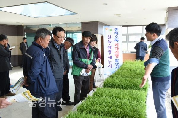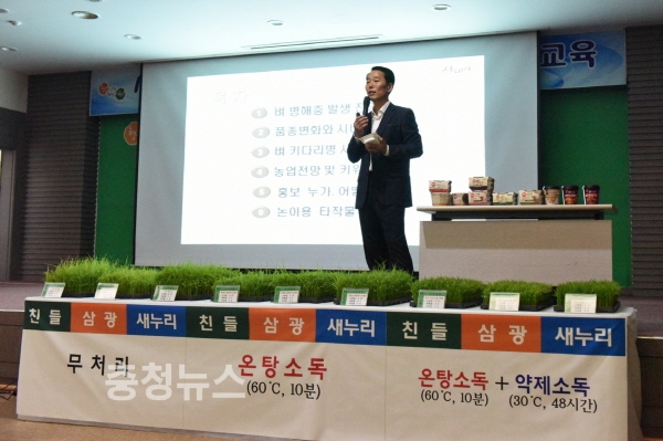 교육전 시연장에서는 지역농업인이 선호하는 삼광, 새누리, 친들 등 3품종을 대상으로 △무처리 △약제 침지소독 △온탕소독 △온탕소독×약제 혼용침지소독 등 다양한 유형으로 처리한 키다리병 발생시험 결과를 비교ㆍ전시해 참여한 농업인의 이해를 도왔다.