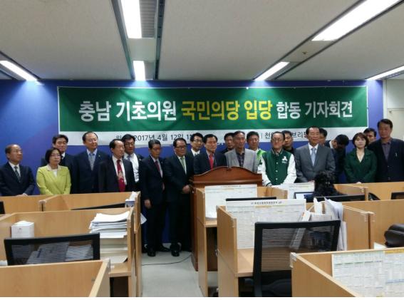 국민의당 충남도당이 12일 오전 천안시청 브리핑룸에서 이해선(60,현 공주시의원,전반기 공주시의회 의장), 류보선(47,현 계룡시의원,전 계룡시의회 의장), 우영길(67, 현 공주시의회 부의장), 고광철(60, 전 공주시의회 의장), 김종근(67, 전 부여군의회 의장)과 국민의당 충남도당 조규선 도당위원장, 김현식(천안병), 조병산(아산갑), 이종설(천안갑), 전홍기(공주, 부여, 청양), 황국연(논산, 계룡, 금산), 채현병(홍성,예산) 지역위원장이 참석하여 합동 기자회견을 가졌다.