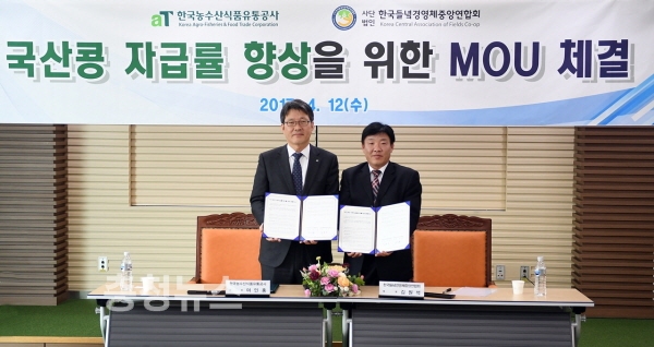 한국농수산식품유통공사(사장 여인홍), (사)한국들녘경영체중앙연합회(회장 김원석)는 12일 전남 나주시 aT 본사에서 ‘국산 콩의 식량자급률 제고를 위한 업무협약(MOU)’을 체결하였다.