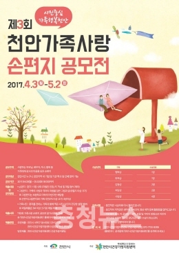 충남 천안시건강가정지원센터(센터장 이은정)는 올해 가정의 달 기념행사의 일환으로 ‘제3회 천안가족사랑 손편지 공모전’을 진행한다.
