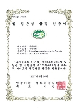 군에 따르면, 미래창조과학부 지정 국가공인 인증기관으로부터 국가정보화 기본법 제32조의2제1항에 근거한 2주간의 엄격한 심사를 통과해 지난해에 이어 3년 연속 웹 접근성 품질인증마크를 획득했다.