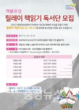 대전 유성구(구청장 허태정)가 책으로 행복한 유성을 만들기 위해 '릴레이 책 읽기' 운동을 전개한다고 17일 밝혔다.