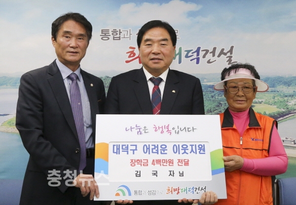 이 장학금은 김국자 할머니가 지난 3년 동안 오정동 일대를 매일 돌아다니며 버려진 종이박스, 신문 등 폐휴지를 수거해 고물상에 팔아 모은 돈으로 마련됐다.