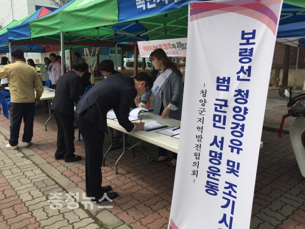 군은 이 같은 의견이 반영되도록 청양군지역발전협의회를 주축으로 전 군민을 대상으로 서명운동을 전개하고 있다. 지역발전협의회는 충청지역 발전은 물론 국토의 중심으로 동서로 잇는 노선을 완성해 우리나라 산업과 관광을 발전시키는 원동력이 될 중차대한 사업임을 강조하는 건의문을 관계기관 및 각 정당에 전달할 계획이다.