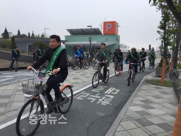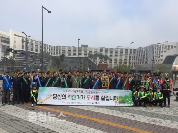 ‘자전거의 날(22일)’을 맞아 세종시 신도시에서 출퇴근 때 자전거 이용을 장려하는 캠페인이 열렸다.