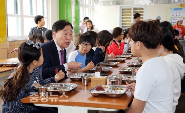 설동호 교육감이 탄방초에서 아이들과 급식을 먹으며 이야기하고 있다.