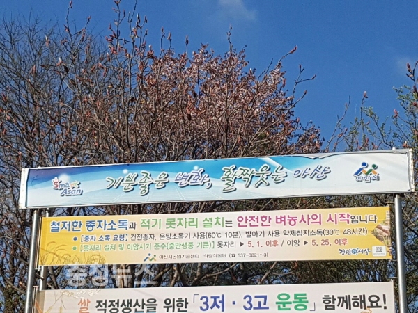 충남 아산시 농업기술센터(소장 남경필)는 21일부터 5월 10일까지 본격적인 못자리 이앙기에 앞서 ‘올바른 온탕소독 및 정확한 못자리 관리’를 통한 키다리병 방제 현장지도를 추진할 예정이다.