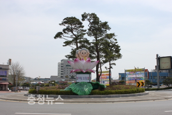 충남 금산군은 5월3일 부처님 오신날을 앞두고 금산읍 금산교사거리에 대형 아기부처와 연꽃잎 조형물을 설치했다.