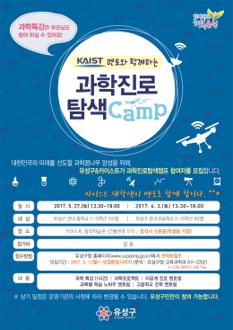 대전 유성구(구청장 허태정)가 4차 산업혁명의 초석이 될 과학꿈나무 양성의 일환으로 오는 5월 27일, 6월 3일'과학진로탐색캠프'를 2회에 걸쳐 카이스트 본원에서 개최한다고 25일 밝혔다.