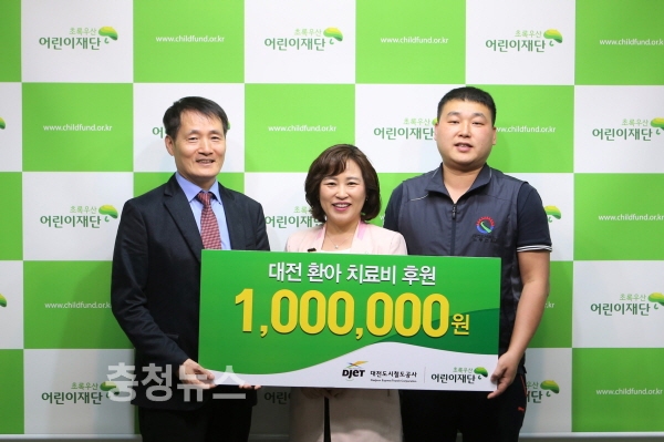 대전도시철도공사(사장 김민기)는 26일 서구 둔산동에 위치한 초록우산어린이재단 대전지역본부 회의실에서 송치영 경영이사, 김대영 노동조합 사무처장과 박미애 초록우산어린이재단 대전지역본부장 등 10여명의 관계자가 참석한 가운데 환아 치료비 1백만원을 전달했다.