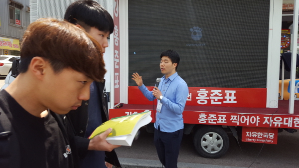 자유한국당 대전시선거대책윈원회는 26일 오후, 오정동 한남대 후문에서 대학생들을 대상으로 홍준표 후보 지지호소와 함께 투표 독려를 위한 유세를 펼쳤다.