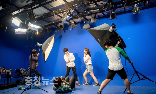 한국영상대 학생들이 대학 스튜디오에서 광고촬영 실습을 하고 있다
