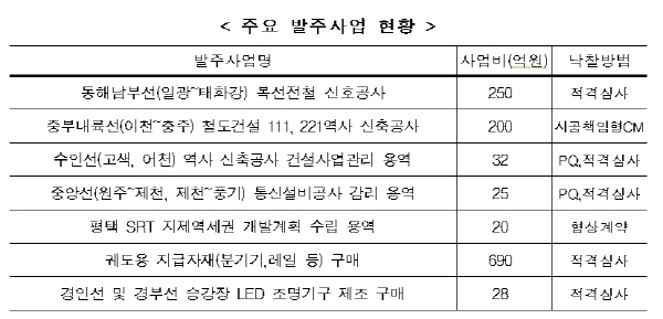 주요 발주 사업으로는 동(東)부산권의 접근성 개선 등을 위한 동해남부선 2단계 구간의 신호공사를 비롯하여 수도권과 중부내륙권 간의 철도서비스 확대를 위한 이천∼충주 간 역사건축, 중앙선 통신공사 감리용역, 궤도용 지급자재 구매 등이다.