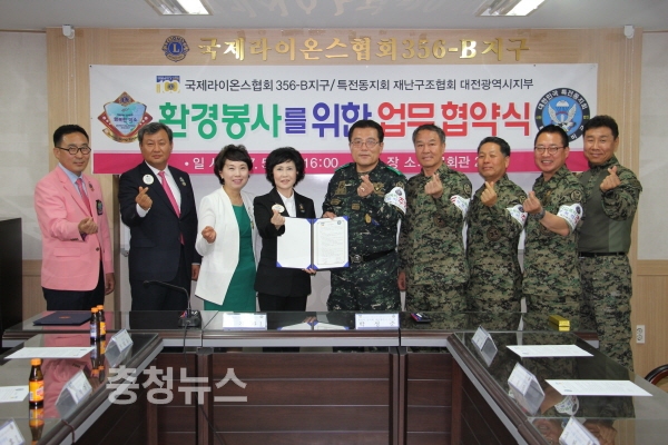 국제라이온스협회 356-B지구 송경자 총재는 4일 지구회관에서 특전사동지회 재난구조협회 대전광역시 지부 (지부장 박성준)와 환경봉사 확대전개를 위한 상호봉사업무협약을 체결하였다.