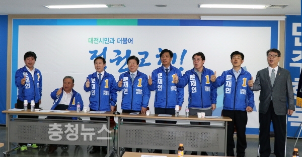 이날 기자회견에는 대전선대위 박병석‧이상민 상임고문, 박범계 상임선대위원장, 조승래 총괄선대위원장, 강래구‧송행수‧박종래‧김제선 공동선대위원장 등이 참석했다.