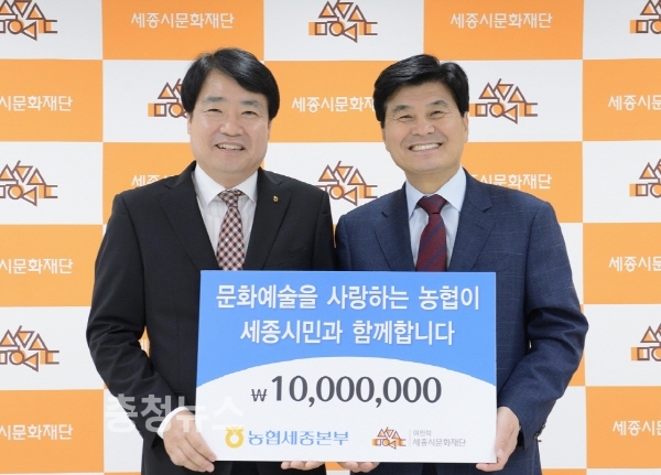 후원금은 10일 세종시문화재단 대회의실에서 김훈태 농협 세종본부장으로부터 이춘희 세종시문화재단 이사장에게 전달됐다.