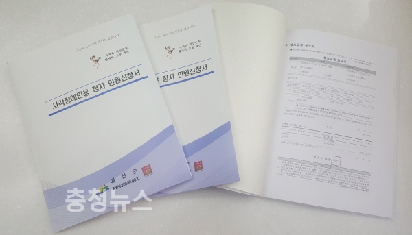 충남 예산군은 사회적 약자의 이용 편의를 돕고자 장애인 이용이 많은 군청 민원실과 12개 읍·면 민원실에 민원 편의용품을 제작해 배부했다고 11일 밝혔다.