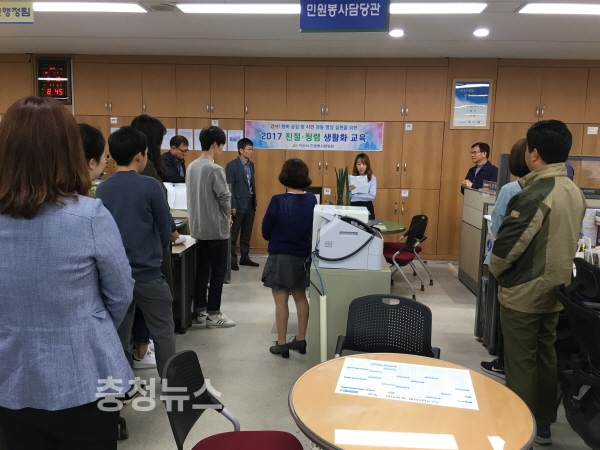 민원실 친절교육은 ‘감사와 행복 공감 전도사 역할로 시민 감동 행정을 실천하자’는 목표로, 전 직원이 돌아가며 스스로 친절 강사가 되어 사안별 경험과 친절 사례를 공유하고 업무를 개선하는 친절교육에 적극적으로 참여하고 있다.