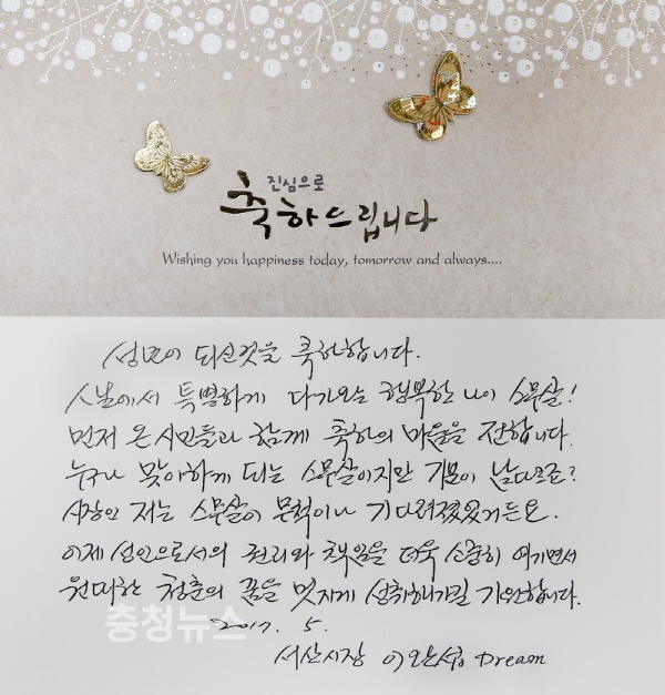 충남 이완섭 서산시장이 오는 15일 제45회 성년의 날을 맞아 자필 서한이 실린 축하카드를 발송해 눈길을 끌고 있다.
