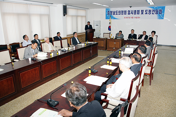 충청남도의회 의정회(회장 김성진)는 19일 오전, 도의회 의원회의실에서 이완구 충남도지사, 김문규 충남도의회의장, 의정회 회원 등 30여명이 참석한 가운데 ‘충청남도의정회 임시총회 및 도정간담회’를 가졌다.