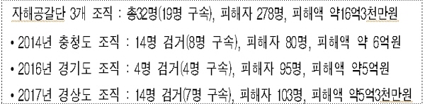 이로써 충남청 광역수사대는 2014년에 주로 충청도에서 활동하는 일명 충청도 조직 14명을 검거하였고, 2016년에는 경기도를 기반으로 범행한 일명 경기도 조직 4명을 검거하는 등 전국의 자해공갈단 3개 조직 32명을 검거하였다.