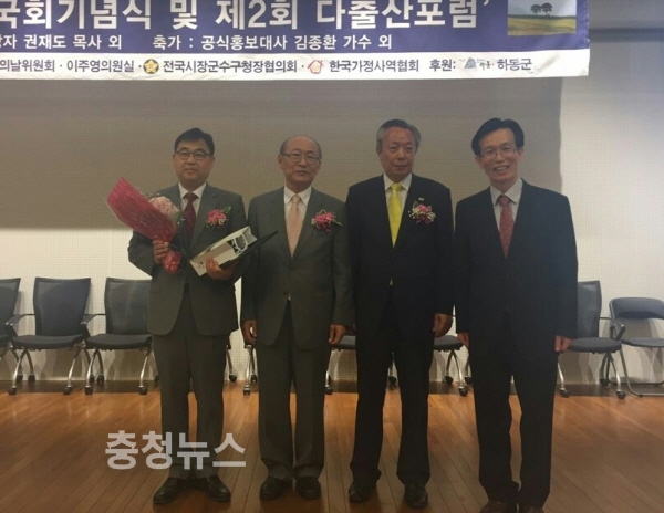 세종시가 16일 국회도서관 대강당에서 열린 '2017 세계부부의날 국회기념식'에서 '2017 올해의 부부문화 도시상'을 수상했다. (사진 왼쪽부터) 강성기 세종시 행정복지국장, 허일룡 부부의날 위원회 이사장, 윤상기 경남 하동군 군수, 권재도 한국가정사협회 대표(목사)