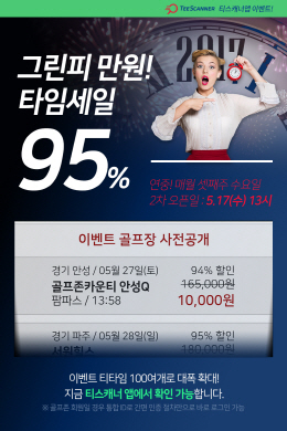 신개념 모바일 골프 부킹앱인 ‘티스캐너’로 골프부킹의 새로운 장을 열어가고 있는 골프장 토털서비스기업 ㈜골프존카운티(대표이사 김준환)가 오는 17일 수요일 오후 1시부터 2시까지 1시간 동안 ‘그린피 최대 95% 할인 이벤트’를 진행한다.