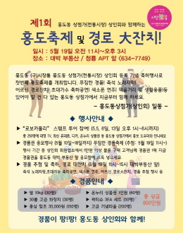 이번 축제는 홍도동 상점가 상인회(회장 하광수) 주관으로 진행되며 지난해 6월 전통시장 상인회 등록을 축하하는 동시에 저렴하고 다양한 품목으로 고객만족도가 높은 홍도동 상점가만의 매력을 널리 알리고자 마련됐다.