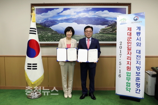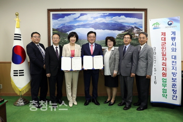 중장기복무 제대군인의 일자리 발굴 확대와 정보공유 강화를 위한 업무협약식이 16일 대전지방보훈청장(강윤진)과 계룡시장(최홍묵) 및 관계관 등이 참석한 가운데 계룡시청에서 진행되었다.