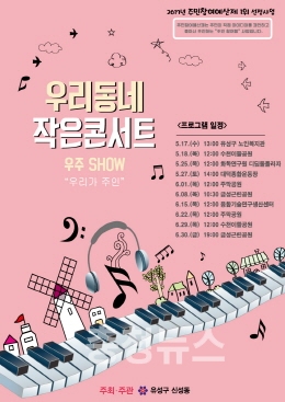 유성구 신성동주민센터(동장 송웅섭)는 17일부터 총 10회에 걸쳐 마을 구석구석을 돌며 우리동네 작은콘서트 ‘우주쇼’를 개최한다고 17일 밝혔다.